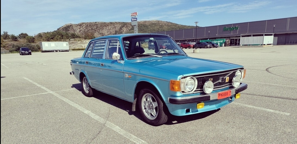 Her er en Volvo 144 som ernesten 50 år gammel. Denne som stod på plassen til Vikan handelspark er en 1973 modell, og den var det året ganske mye forandret fra 1972. Ny innredning med blant annet nytt instrumentpanel med runde instrumenter, nytt ratt med en pute i midten som da ble ansett for å kunne dempe skader ved kollisjon, ny front med plastgrill og store blinklys, nye baklys på sedanmodellene som fulgte med til 240-serien, stålbjelker i dørene for bedre kollisjonssikring, nye støtfangere. Om en slik dukker opp påbilens og Mc dag i Kristiansund lørdag er ikke kjent. ( BN foto)