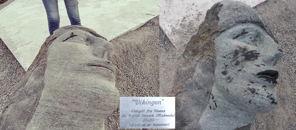 Skulpturen av " Vikingen" oppe ved scenen på Kultursti Vevang. Vi tok bilde av den for noen dager siden i opprinnelig stand. Til høyre tilgriset. ( Foto: Boa/BN)