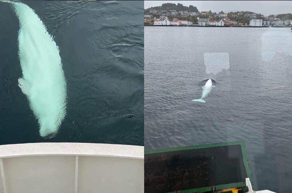 En hvitval som har fått navnet Hvaldimir er å se i havna i Kristiansund. Sundbåtselskapet ( KKS) skriver: Vi fikk storfint besøk på Piren i dag. Hvaldimir hilste pent på MS ANGVIK, før han loset oss til Tahiti. Gratis kortreist hvalsafari. ( Foto KKS)