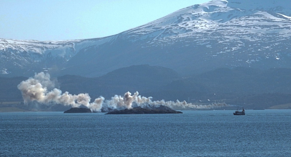Ved 17:30 tiden søndag oppstod en voldsom røykutvikling fra en fiskesjark i Låvøyfjorden utafor Bjellvågen. Det så etter hvert ut at dette kom fra eksossystemet. Etter hvert kom en mindre båt og fikk buksert sjarken til land i en av småbåthavnene som er der. ( BN foto)