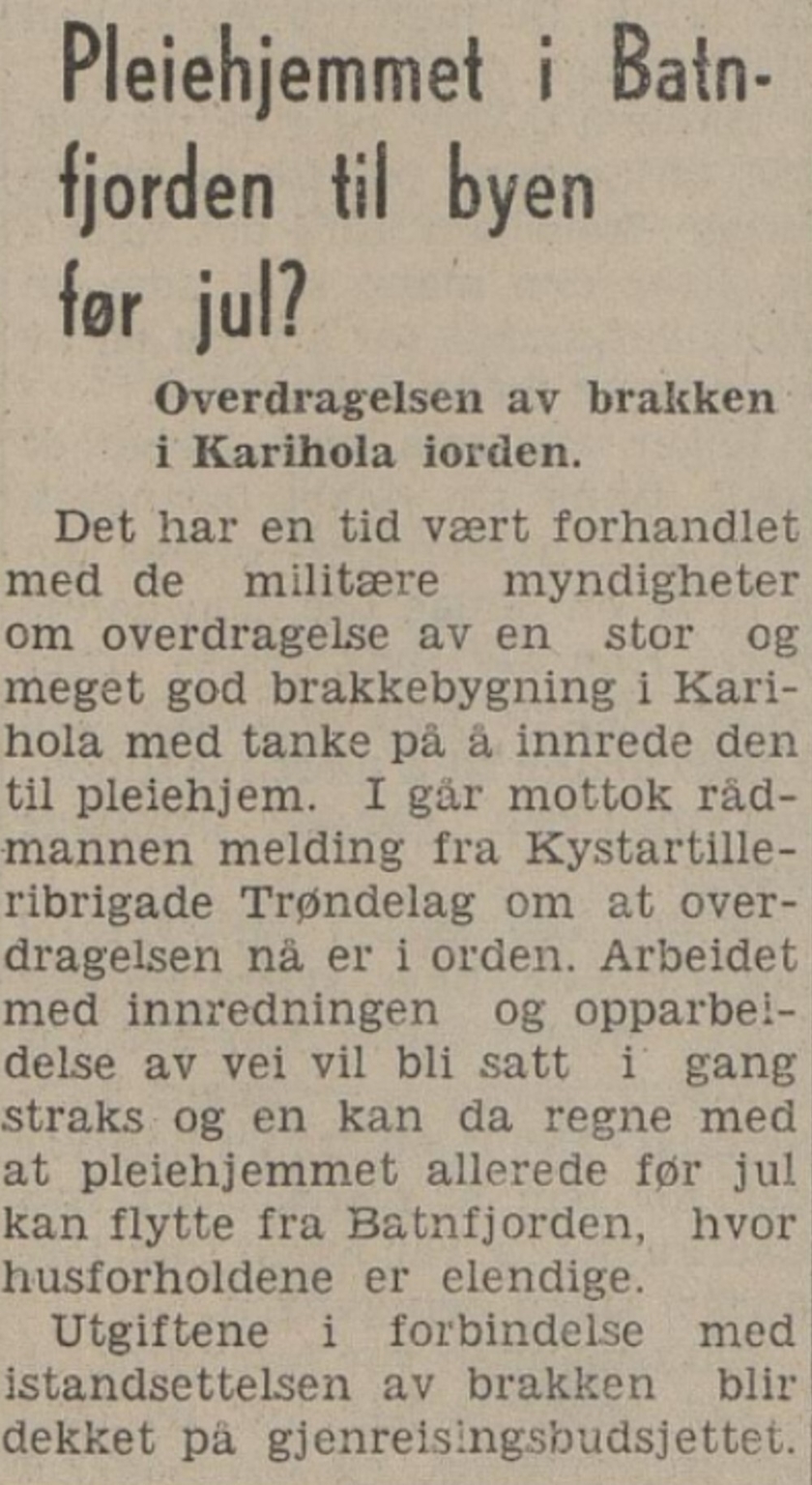 Heimevernsbrakka i Karihola ble revet rundt 1994 for å bygge Karitunet Bo og avlastingssenter i Tangstien. Denne brakka var det Trøndelag kystartilleriavdeling som tok over etter tyskerne i 1945. Senere da enheten ble lagt ned ble det i 1947 pleiehjem i Kristiansund her ute. Heimevernet i Kristiansund overtok brakka etter det trolig i slutten av 1950 årene. ( Foto: Nasjonalbiblioteket)