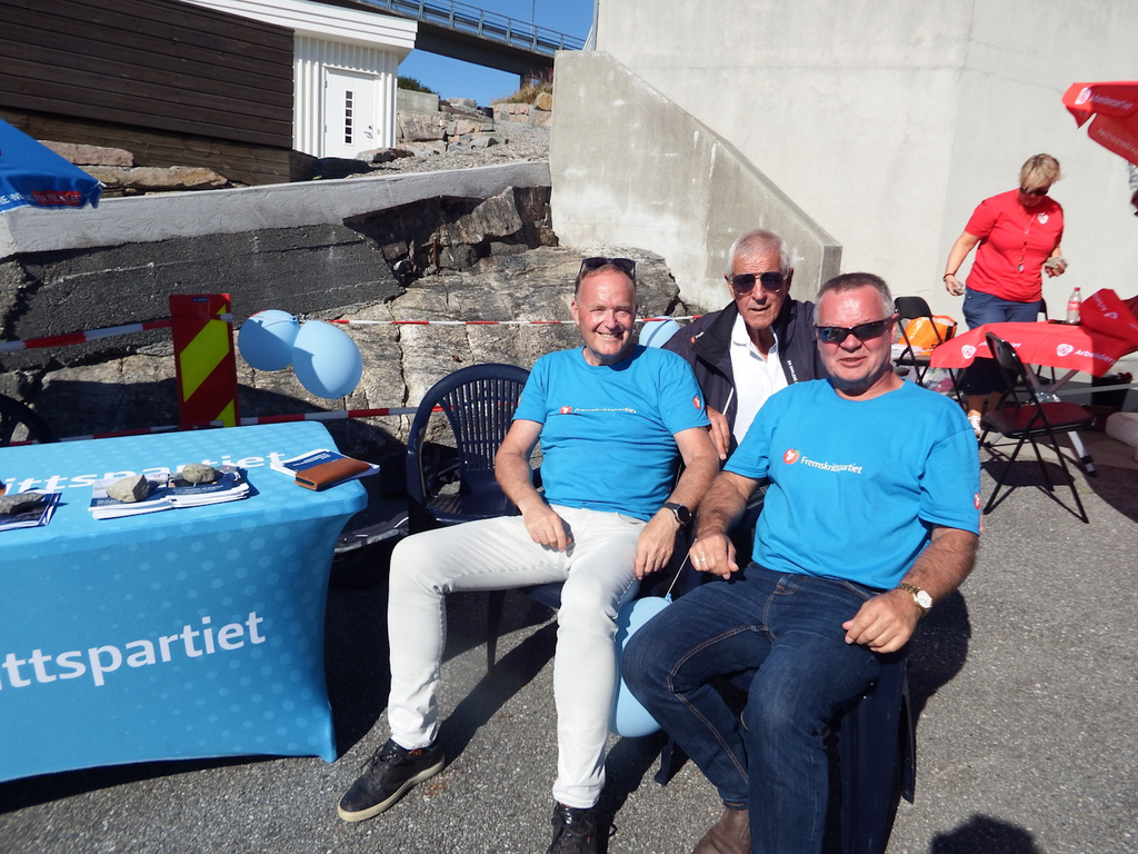 Fremskrittpartiet i Averøy var her sammen med andre politiske infoboder. F.v. Tor Finn Isaksen, Olav Engvik og Odd Willy Sakshaug. ( BN)